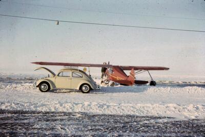"David Hills' [Hilts'] Volkswagen holding wing for Gene Stolberg's plane, [Kotzebue, AK,] January or February 1964."