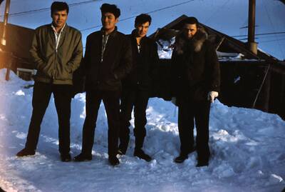 Frank Norton, Noah Downey, and George Stalker on their way from Noatak to Fort Ord, with Earl Perisho. Front Street, Kotzebue, AK, 25 February 1962.